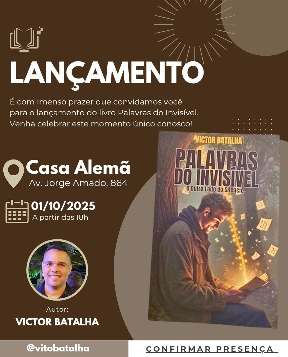 No próximo dia 1º, na Casa Alemã (avenida Mário Jorge, 864), o escritor Victor Batalha lança ‘Palavras do Invisível, o outro lado do silêncio’, romance que fala sobre perda, fé, superação, amor e reencontro. É uma obra que mostra ao leitor que o amor nunca se perde, apenas se transforma.