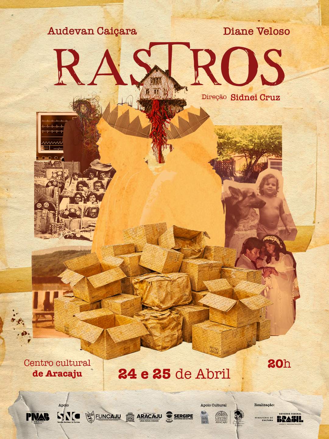 O espetáculo teatral Rastros estreia nos dias 24 e 25 de abril, às 20h, no Palácio-Museu Luiz Antônio Barreto (Centro Cultural de Aracaju), na região central da capital sergipana. A entrada é gratuita, por ordem de chegada, e sujeita à lotação máxima de 50 pessoas por sessão.